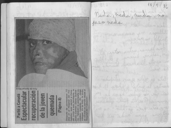 Es súper sencillo, en realidad, o sea… Es como lo que yo… escribí de lo que vi, y… que a mí me impresionó mucho, lo de los jóvenes quemados. Entonces, escribí sobre lo que pasó porque para mí fue así como “yo tengo que recordar esto”, para mí fue así como “yo me tengo que acordar, yo quiero recordar los nombres de estas personas, yo no me tengo que olvidar de esto que pasó”, eehh, como “tengo que siempre saber esto y cómo contarlo”, como… […] Entonces yo escribí, escribí sus nombres completos, como para saber que eso pasó y a quienes les pasó y todo. Y después, cuando salió la foto de Carmen Gloria en el diario, yo la recorté y la pegué en mi diario de vida y puse así como “Salió esta foto” (Evelyn Moreno).