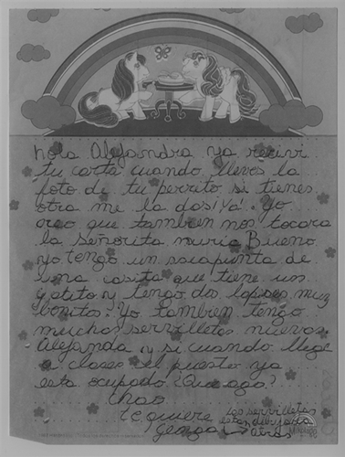 Dadas las características de los objetos mencionados (dibujos, cartas, postales, grabaciones de audio, textos producidos en el contexto escolar y familiar), la clasificación realizada subraya el carácter subjetivo de cada producción; para ello hemos distinguido cada objeto según el receptor real o imaginado que inspira/motiva la producción analizada (Castillo, 2015a). Este, entre otros criterios, corresponde a una lógica que se ha dejado guiar por lo que Leonor Arfuch (2010) denomina la “voz enunciativa”, que asume que “la situación de enunciación y el otro, el interlocutor, impondrán una forma del relato que es la que hará justamente a su sentido” (p. 27).