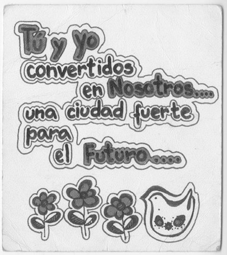 De todas formas, si se pudiese establecer un tránsito cronológico de estos lugares infantiles en el tiempo estudiado es posible proponer que, conforme avanzan las edades de los niños y las niñas, va cambiando la correlación de fuerzas políticas y la resistencia contra la dictadura va organizándose de manera pública, ello se inscribe en las producciones que refieren al lugar, el lenguaje de la resistencia se torna cada vez más identificable tanto en su contenido como en los aspectos estéticos de las producciones infantiles del periodo. En los mensajes de amistad o de amor se utiliza una iconografía y lenguaje específicos que corresponden a la divulgación de consignas de las izquierdas en la época; estos mensajes no parecen tener una finalidad claramente concientizadora, sino más bien, se constituyen en un particular lenguaje del afecto y de claves para el reconocimiento entre semejantes, dando paso a la creación de lazos exogámicos de afecto en un nuevo escenario para el “nosotros” (véanse imágenes 15, 16 y 17).