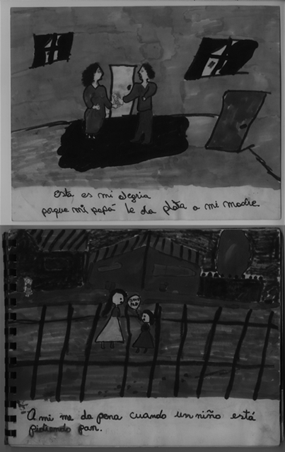 El dibujo de Fidel y Elisabeth (véase imagen 1), es particularmente interesante en esta materia, pues corresponde a niños que realizan estas creaciones respondiendo a una consigna de la institución en la que se les solicita que escriban o grafiquen sus deseos de fin de año. Este trabajo, correspondiente al año 1986, involucra sólo a niños que se encuentran en procesos reparatorios en el organismo debido a que, por acción del Estado, alguno de sus familiares ha sido afectado por la prisión política, el exilio o la desaparición forzada. En ese sentido, resulta interesante constatar que varias de las producciones que la organización archiva respecto a esta actividad remiten específicamente a este tema, el cual se superpone a los dolores singulares que cada quien tuvo/tiene según su pérdida individual. Esto también ocurre en los dibujos resguardados por la fundación entre niños los cuales consisten en reacciones al taller de trabajo afectivo en sectores desfavorecidos de la zona sur de Santiago (véanse imágenes 2 y 3).
