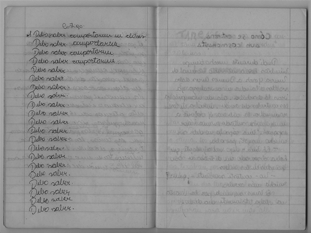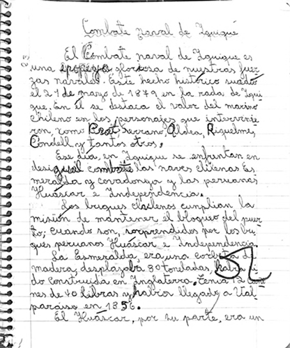 En el caso de la escuela como territorio, la escena es bastante más clara, en parte porque accedemos a los documentos oficiales que permiten reconstruir los bordes del acontecimiento político denominado Dictadura, el cual resitúa los márgenes de la escuela a través de la prohibición de contenidos, la militarización de los aspectos de presentación personal e higiene, así como los sentidos patrios como eje central del currículo. Sin embargo, los documentos de los niños, particularmente los cuadernos escolares, nos permiten acceder de manera mucho más próxima tanto a los contenidos impartidos en los establecimientos, como a las divagaciones o sus formas sutiles de evasión.