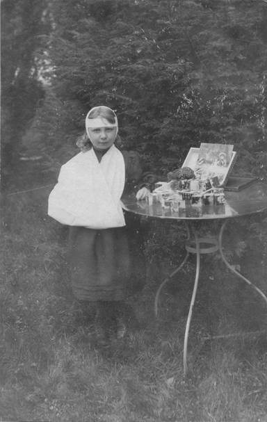 A su vez, los juguetes de las niñas (muñeca, casa de muñeca, vajilla) tenían por objetivo confortarlas en el espacio doméstico y acostumbrarlas a su futura función de esposa y madre. Verdadera dama en miniatura, la muñeca recibida por Amalia Errázuriz era lujosa, con un “cuerpo (…) de badana y color carne”, una “cara de porcelana blanca y rosada”, unos “ojos de cristal celeste” y un “cabello rubio verdadero” (Errázuriz, 1925, p. 18). Llamada Pelagia, en honor a la tía de Amalia, Pelagia Errázuriz Valdivieso, por el parecido de sus trenzas, la muñeca venía con un ajuar completo en una maleta, que incluía ropa interior en encaje de Valencienne, vestidos de muselina, seda y lana, sombreros, accesorios para peinarlas y joyas.13 Como se trataba sin embargo de un objeto de lujo más que de un verdadero juguete, se ordenó muy luego en su maleta y Amalia no pudo jugar con ella más que en ciertas ocasiones, lo que permitió la perennidad del objeto (Errázuriz, 1925, pp. 17-19).14 En una fotografía de circa 1905, que retrata una de las hijas del poeta y dramaturgo Manuel Magallanes Moure (1878-1924), se puede apreciar un ejemplo de este tipo de muñeca, con su vestido, sus inglesas con tocado de pluma y su abanico (véase imagen 2). Incluso algunas tenían un mecanismo que les permitían hablar, como la que le fue regalada a Carmen Lynch en 1891, que podía decir papá y mamá (Díaz, 2016, p. 72).