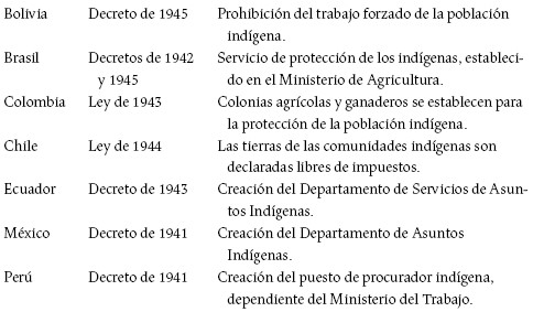 En el curso de los años de 1940, la región podía mostrar ciertos progresos en materia legislativa y de defensoría indígena, tal como se presentan en el cuadro 1.