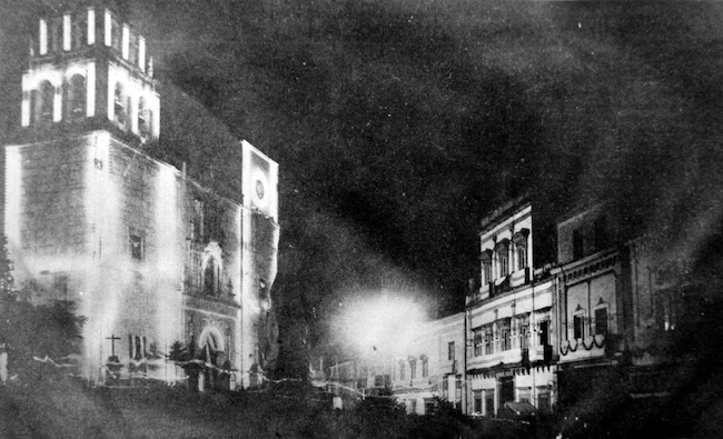 Tres recursos técnicos convienen resaltar de esta cobertura. En primer lugar, la toma de fotografías nocturnas, como una muy bien lograda que muestra la parroquia, en la plaza de la Paz, para la cual el fotógrafo debió de abrir el diafragma al máximo y calcular un tiempo de exposición lo suficientemente prolongado para que se distinguieran las fachadas de los edificios (véase imagen 1). En segundo, las fotografías con un equipo de alta velocidad de obturación, como la registrada en el momento en que el presidente apareció en el balcón del palacio legislativo y algunos de los integrantes de su comitiva se alzan el sombrero en señal de saludo; para lograrla, el fotógrafo debió subir al edificio de enfrente y posteriormente se recurrió a una ampliadora para distinguir al invitado de honor (véase imagen 2). En tercer lugar, la variedad de formatos utilizados y el trabajo de edición hecho sobre la mesa: unas fotografías parecen haber sido tomadas con placas muy grandes, otras posiblemente con una cámara panorámica de lente oscilante, capaz de tomar ángulos de 90 a 110 grados (véanse imágenes 3 y 4), y otras con cámaras convencionales, todo lo cual habla de uno o varios fotógrafos que conocían y utilizaban sus equipos de manera consciente y solvente.