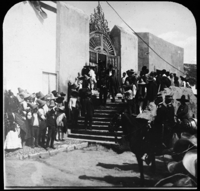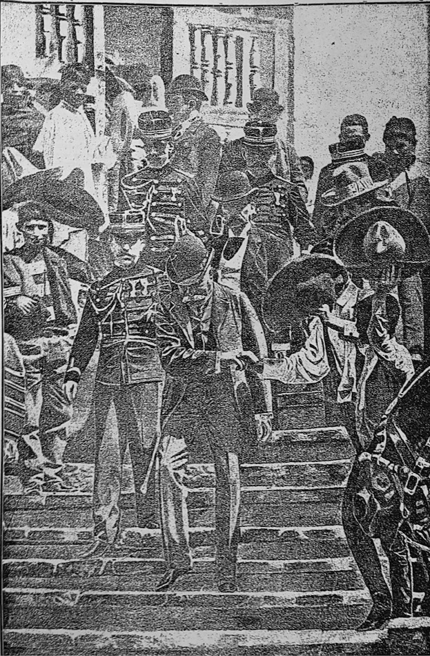 De la escena han sobrevivido al menos tres fotografías diferentes, dos de ellas capturadas por fotógrafos profesionales y la otra por un aficionado. Se trata de una secuencia en la que puede adivinarse la colocación de tres fotógrafos distintos, uno junto a otro -seguramente cuidados por la guardia presidencial- con tres equipos y tres habilidades para captar el instante. Esta vez el fotógrafo aficionado logró la mejor placa: en formato estereoscópico quedó grabado el momento en que Díaz cruza la puerta y se dirige a las escaleras entre las miradas de respeto de gente humilde y el ojo vigilante de los gendarmes de caballería (véase imagen 14). Dos pasos abajo otro fotógrafo accionó su cámara, pero el presidente apareció en una pose poco favorable, con la cabeza baja, poniendo cuidado en los escalones (véase imagen 15). Sobre el mismo escalón, pero una fracción de segundo después, un tercer fotógrafo apareció, casi al frente del protagonista; era “nuestro reporter-fotógrafo Sr. A [gustín]. V [íctor]. Casasola”, del Semanario Literario Ilustrado, quien captó una instantánea aún menos lograda, un presidente que no detiene su paso y con displicencia saluda a un hombre sencillo que se quita el sombrero ante él (véase imagen 16). La dirección del semanario decidió recortarla (para dar una impresión de cercanía entre el fotógrafo y el protagonista) e incluirla en portada con el pie: “El General Díaz da la mano a un barretero al salir de la iglesia ‘La Valenciana’”. A pesar de que la imagen proyecta autoridad, el gesto del líder no era el que solía y convenía mostrar.