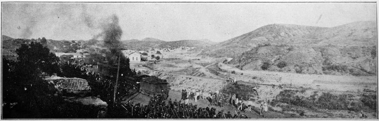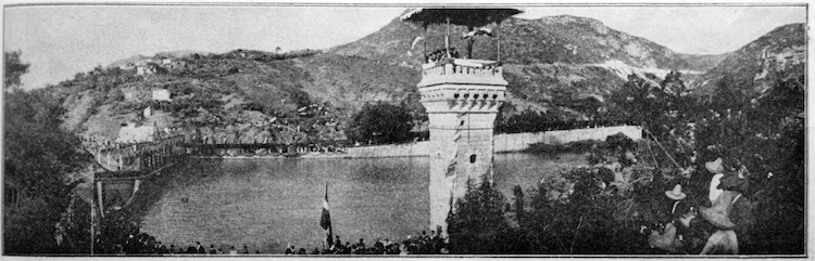 La presa de la Olla era en 1903 la culminación de un paseo al que se llegaba desde el centro de la ciudad, en cuyos márgenes se habían levantado desde la década de 1860 las casas de algunos de los miembros de la elite (Alcocer, 2002, pp. 75 aa., y ss. ). Ese día, alrededor de la presa se construyeron tribunas de madera “cómodas y elegantes”, “destinadas al señor presidente y su comitiva, al cuerpo diplomático, a los representantes de la prensa y a las familias de los convidados”.32 En su estilo y con lujo de detalles El Imparcial describió la salida hacia la presa: “Cuando el señor general Díaz se presentó a los ojos de aquella gran muchedumbre, la aclamación que estalló de todas las bocas fue indescriptible”; el trayecto estaba “espléndidamente adornado” y sobre el carro presidencial lanzaron “confeti, serpentinas y rosas”. Ya en la presa hubo honores militares al presidente, que se instaló en su tribuna especial desde donde tenía a la vista las lomas vecinas, con “un sello muy pintoresco”, rebosando de gente “que ocupaba millares de tiendas de campaña” (véanse imágenes 6 a 8).33