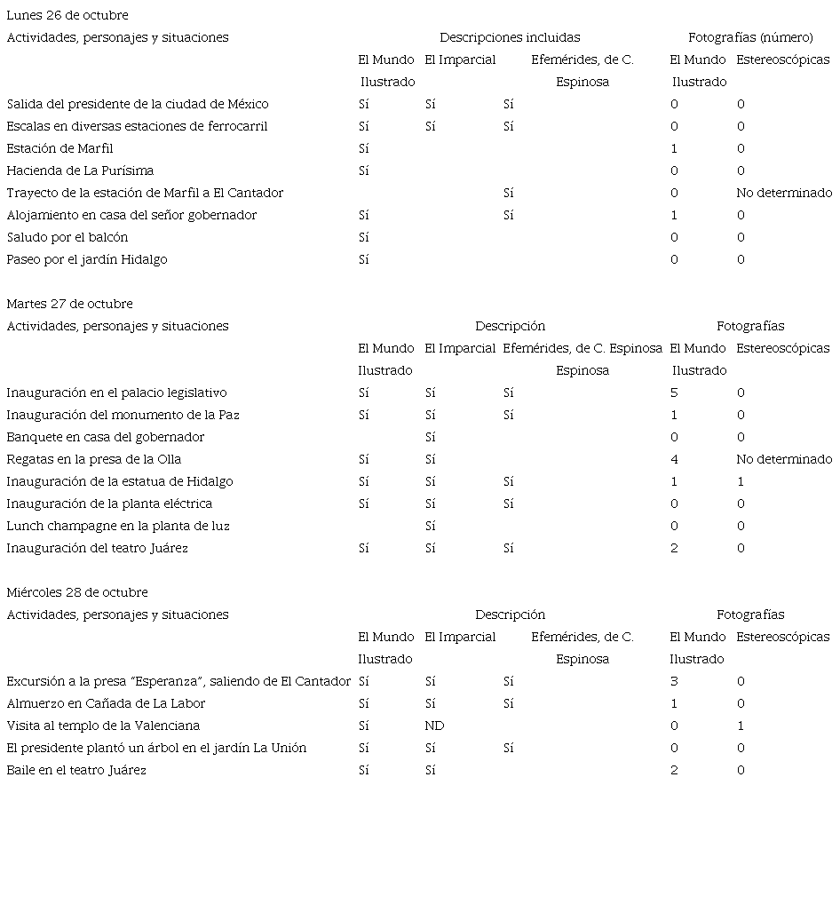¿Cómo tener referencias detalladas de la visita y establecer qué actividades y lugares fueron fotografiados o difundidos en imágenes? A través de las múltiples fuentes consultadas, el cuadro 1 sintetiza y permite profundizar en los diferentes tipos de registros hechos de la visita, primero en relatos o “imágenes narradas” (un diario: El Imparcial, un semanario: El Mundo Ilustrado, y una crónica histórica: las Efemérides de Crispín Espinosa), y en imágenes fotográficas (las publicadas en El Mundo Ilustrado y las capturadas en formato estereoscópico por uno o varios fotógrafos anónimos, de Guanajuato). Siguiendo los momentos y escalas fundamentales de las jornadas, una primera lectura muestra el cuidadoso trabajo descriptivo y adulador de El Mundo Ilustrado, que perdió pocos detalles. En cuanto al material gráfico también destaca el papel del semanario, aunque el acceso a los fotógrafos fue más restringido, o no hubo espacio suficiente en las páginas de la publicación, o en la mesa editorial no se consideró necesario incluir todos los detalles. Los registros de la cámara estereoscópica (conservados en un archivo local),30 en cambio, no corresponden a una serie como sus primeras lecturas sugirieron; por lo que se conserva no parece que su autor pretendiera o pudiera seguir paso a paso al invitado, más bien logró llegar o sólo quiso participar y guardar recuerdos de tres momentos: en la inauguración del monumento a Miguel Hidalgo, en la visita al templo de San Cayetano -en Valenciana- y muy posiblemente en las regatas de la presa de la Olla.