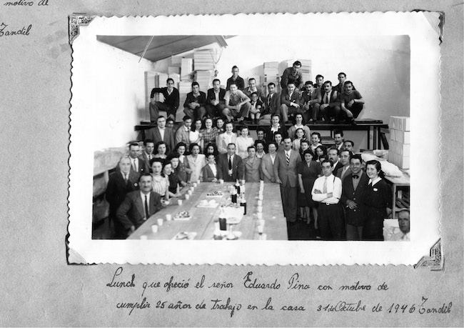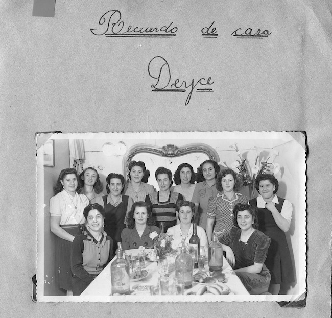 La primera página del álbum contiene tres fotografías que muestran a Sara junto a otras jóvenes en el taller de costura. Una de ellas las “toma” en plena tarea, mientras que en las dos restantes se encuentran alrededor de una mesa dispuesta para una celebración (véase imagen 2). Las diez páginas siguientes contienen fotografías de su paso por la casa comercial. Las intervenciones que realiza Sara indicando tiempo, espacio y motivo u ocasión de las tomas muestran que se trata de “recuerdos”, particular y especialmente, de sus compañeras(os) de trabajo. Es a ellas(os) a quienes decide presentar en primer lugar, y es formando parte de ese grupo que se presenta a sí misma.