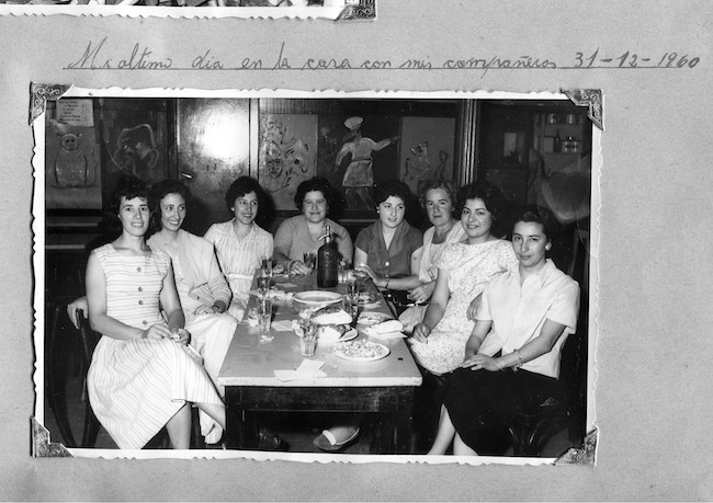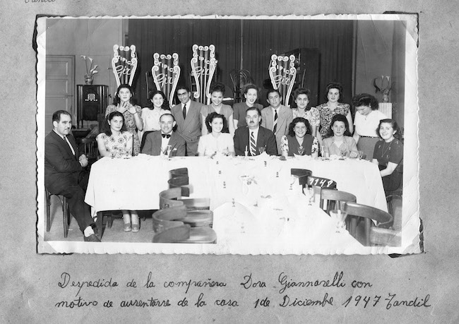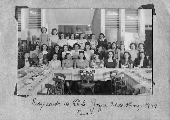 El álbum se inicia así con imágenes que muestran a Sara en los espacios laborales por los que transitó. Sin embargo, no es el trabajo como actividad lo que se encuentra representado en ellas, sino lo significativo del ámbito laboral como espacio de -y ocasión para- la sociabilidad. En esas primeras páginas que abarcan un periodo que va de 1944 a 1960, las fotografías seleccionadas fueron todas tomadas en ocasión de celebraciones y despedidas. Algunas de ellas muestran a Sara y sus compañeras(os) reunidos para la ocasión en el taller o en el amplio patio de la casa comercial; en otras, Sara y el grupo de compañeras(os) son retratados en confiterías, clubes o restaurants (véanse imágenes 3 y 4).