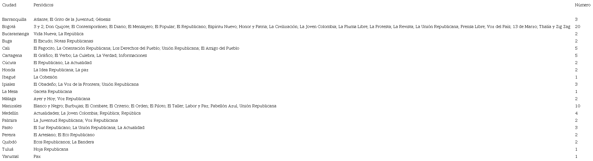 En el cuadro 5 enlistamos los periódicos republicanos en diferentes ciudades y municipios de Colombia, que fueron los encargados de circular el discurso republicano.