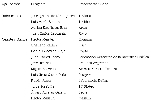 La agrupación MIN-Industriales está integrada por un importante número de capitales pequeños (metalurgia, juguetes, calzado y textiles), así como por grandes grupos económicos (Techint y Arcor). Por su parte, MIA-Celeste y Blanca también tiene una composición heterogénea: capitales pequeños que se acumulan en la industria plástica y gráfica; grandes capitales nacionales (Ledesma, Aceitera General Deheza, SanCor, Molinos Río de la Plata y Mastellone, por ejemplo) y extranjeros (Nestlé, Coca Cola, Kraft, Quickfood, Cargill, Pepsi Cola, Dreyfus, Cervecería Quilmes), que hacen lo propio en las ramas de la industria automotriz, alimentación y agroindustria (Schteingart, 2011).