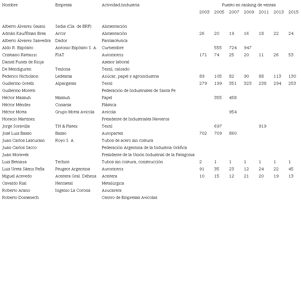 Muchas de las empresas a las que pertenecen los dirigentes que han formado parte de la comisión directiva entre 2003 y 2015 componen el ranking de las 1 000 más vendedoras en el mercado local (véase cuadro 2). La mayoría, sin embargo, no llega a ocupar los primeros 100 puestos. Lascurain, De Mendiguren, Rial y Méndez coexisten con dirigentes de capitales que no figuran en el ranking, aunque representan ramas de la industria textil y metalúrgica, muy dinámicas durante el kirchnerismo.