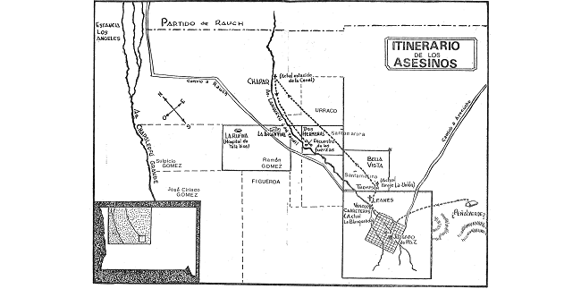 El itinerario de la matanza, que llamativamente los ideólogos no se percataron de disimular, no es un dato de menor valía para diluir el rótulo de acto xenofóbico a secas. El asesinato de carreteros de paso por el pueblo y almaceneros que difícilmente fiaran a criollos pobres, representa los casilleros elegidos por los jinetes para llegar antes del amanecer a lo de Chapar. Esa cabalgata inexplicable de cuatro leguas apenas disimulada con la muerte de dos italianos −un hombre al dejar la plaza y un niño que ayudaba en un almacén−, parecen ampararse en una impunidad que se rompe en mil pedazos al encontrarse con una partida retrasada que disimulaba urgencias.