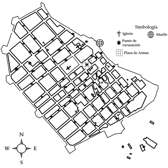 Este procedimiento se siguió de manera puntual durante el bienio 1816-1817, vacunando, en promedio, cada seis días en distintas partes de la ciudad. Como resultado, desde que se estableció la comisión permanente en 1816 y hasta 1817 se realizaron 350 vacunaciones en 69 partes de la ciudad, lo que indica que algunas locaciones se repitieron en más de una ocasión.21 A continuación, se presenta el mapa 1 de Veracruz del año 1800 en el que se contempla un plan de crecimiento de ampliación de dicho año. Para efectos prácticos, el mapa ejemplifica lo que debió ser el Puerto de Veracruz en los años que se estudian, además, se han señalado los lugares que a partir de la documentación se sabe que sirvieron como punto de vacunación durante el periodo de estudio. El mapa permite observar que la mayor parte de las vacunaciones se realizaron en el centro y sur de la ciudad, muy pocas en la zona extramuros y el resto en la parte norte. La razón de esta distribución posiblemente tiene que ver con las particularidades de la vida urbana ya que, si se observa la simbología del plano, las zonas de afluencia: comercios, tribunales, aduana, parroquias y plazas se encuentran en donde hubo una mayor concentración de puntos de vacunación.