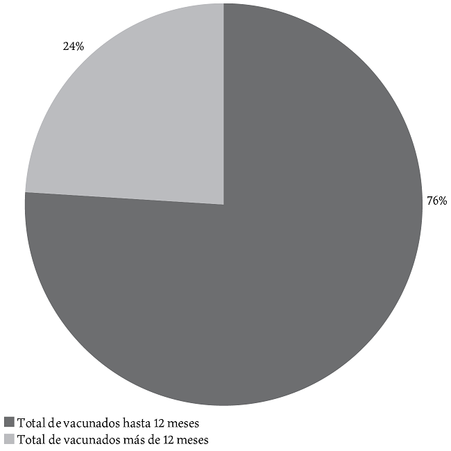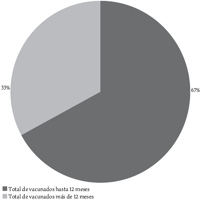 La tercera sección abunda en el estudio de caso: la manera en que la comisión de vacunación operó en el puerto de Veracruz en los años 1816 y 1817; para ello se analizan las actas de vacunación emitidas por las autoridades de la comisión.11 A partir de estas actas se ha identificado la cantidad total de vacunados en el periodo referido, la manera en que se aplicó la vacuna, los lugares donde se vacunaba y los rangos de edad de los inmunizados. Para un tratamiento adecuado de la información se han generado dos categorías para reunir a los vacunados: de cero a doce meses y de doce meses en adelante. Esta división responde a que, según Harrison (2002, p. 1310) , antes de los doce meses se considera que el sistema inmunológico no está del todo listo para adecuarse por completo a la vacuna. Sin embargo, en el periodo estudiado los desarrollos médicos ignoraban esta condición y la edad resultaba indiferente en la aplicación de la vacuna. Como se verá, la mayor cantidad de vacunados se situó en la primera categoría (de cero a doce meses) y esto es un reflejo de la percepción que se tenía sobre la nueva medida preventiva. Además, para ejemplificar el impacto de la campaña, esta sección también incluye un plano de la ciudad de Veracruz en el que se resaltan los lugares en que se aplicaron las vacunas.
