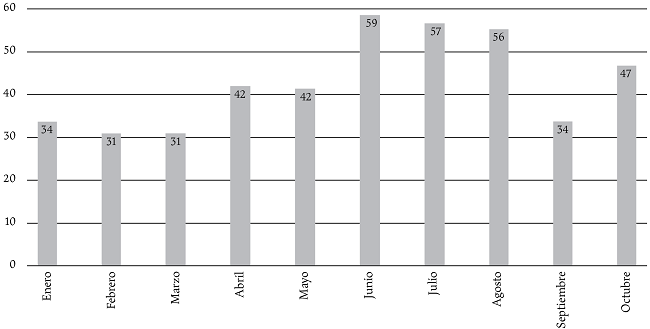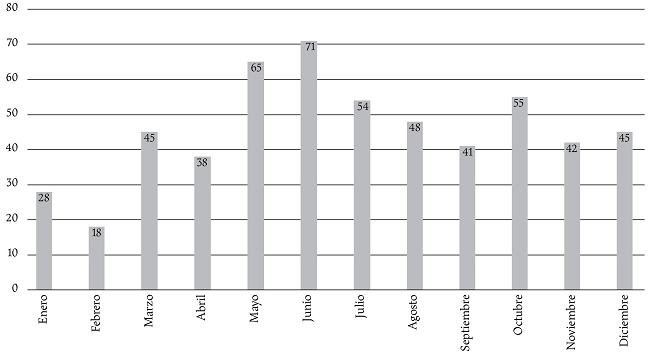 Si la cantidad de vacunados en 1816 se desglosa por mes se obtiene que en promedio se vacunaron 45.83 individuos. De esta forma, es posible estimar que las campañas presentaron una buena recepción entre la población de la ciudad (véase gráfica 2). En gran medida esta suposición se puede hacer porque las autoridades encargadas de organizar las campañas tenían registros de los nacimientos mensuales, esto permitía que dieran seguimiento y vacunación oportuna a los neonatos.23 Sin embargo, la documentación no precisa de qué manera se garantizaba que los nacidos registrados fueran vacunados, por lo que es posible suponer que el convencimiento de los padres era fundamental para concretar el proceso. Lo más destacado de la observación por mes es que es posible identificar los meses de mayo, junio y julio como los de mayor cantidad de vacunados, situación que se explica desde las convocatorias de vacunación, porque en la época se relacionaban los meses de calor como los más propicios para el surgimiento de viruela natural.24