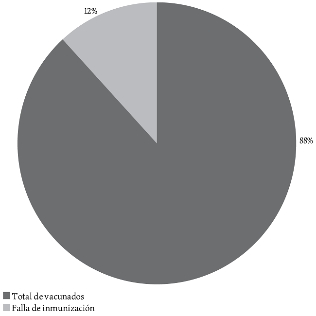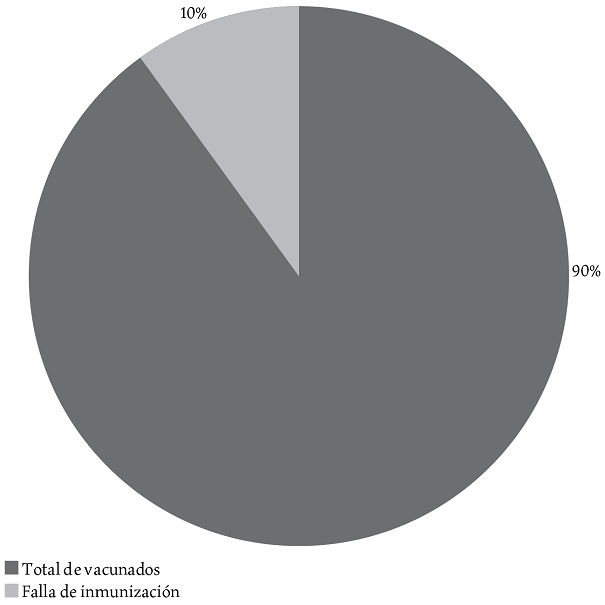 Por otra parte, sobre el total de vacunados en 1816 la falla de inmunización25 se situó en 10% (véase gráfica 3), lo que quiere decir que, de los 550 individuos vacunados, 60 tuvieron que vacunarse más de una vez porque no desarrollaron la reacción esperada. Este dato es destacado debido a que los factores que pudieron incidir en la falla de inmunización van desde una mala aplicación del fluido vacuno hasta que los individuos ya hubieran presentado viruela (de manera leve para no haberlo notado) o alguna variante de viruela bovina que los hubiera inmunizado anteriormente.
