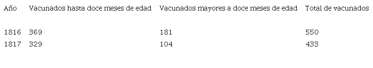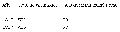 En síntesis, los resultados de la comisión de vacunación del bienio 1816-1817 se pueden agrupar en dos cuadros que reflejan el total de vacunados por año (cuadro 1), así como los vacunados que presentaron falla de inmunización sobre el total de vacunados por año (cuadro 2). Esto permite dimensionar de mejor manera el impacto que tuvo la aplicación de la vacuna en un periodo relativamente corto.