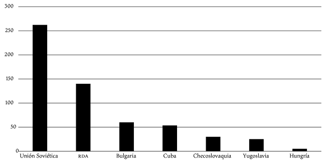 Ese mismo año el gobierno húngaro otorgó a Nicaragua una línea de crédito de 5 000 000 de dólares estadunidenses, a través del Banco Nacional.17 Para evaluarla, hay que tomar en cuenta el crédito ofrecido por otros países. En la lista que recoge los préstamos y líneas de crédito para Nicaragua entre julio de 1979 y junio de 1984 (Berrios, 1985, p. 126), Hungría figura con los 5 000 000 de dólares ya mencionados. En el caso de los países socialistas, la cantidad más grande fue proporcionada por la Unión Soviética (262 200 000 dólares), seguida por la RDA (140 000 000), Bulgaria (60 000 000), Cuba (53 400 000) -¡diez veces más que Hungría!-, Checoslovaquia (30 000 000) y Yugoslavia18 (25 000 000) -aún cinco veces mayor que la línea de crédito húngara (véase gráfica 1).