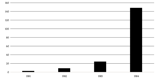 Existen cuadros estadísticos sobre la asistencia prestada por Hungría entre 1981 y 1984. Las cantidades iban creciendo, pero es menester añadir que desde el principio se trató de montos muy bajos. Este apoyo, que incluía auxilio civil -organizado y distribuido por el Comité de Solidaridad y la Cruz Roja Húngara- así como cooperación tecnológica y científica, fue de 2 700 000 ¡de forintos! en 1981. Se triplicó para el año siguiente (8 900 000 en 1982) y siguió creciendo: 24 300 000 en 1983, y 148 200 000 en 1984.20 A partir de 1983 figuró también la ayuda militar, que formó aproximadamente una tercera parte de todo el apoyo otorgado, tanto en 1983 como en 1984. Puesto que el total de 1984 fue seis veces más que en 1983, y la cooperación militar retenía su proporción relativa, llegamos a un crecimiento espectacular en este renglón, de 7 800 000 en 1983 a 43 900 000 en 198421 (véase gráfica 2).