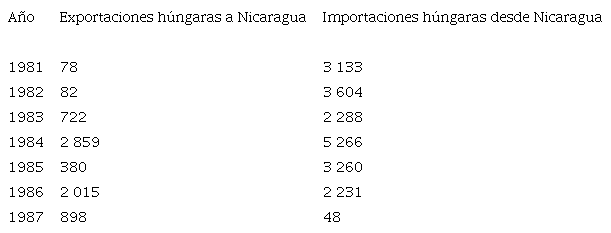 Hubo un crecimiento espectacular en las importaciones húngaras desde Nicaragua. Las cifras respectivas, 3 133 000 dólares en 1981; 3 604 000 en 1982, y 2 288 000 en 1983 pueden parecer poco, pero hay que tomar en cuenta que anteriormente esta interacción no había existido.27