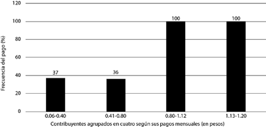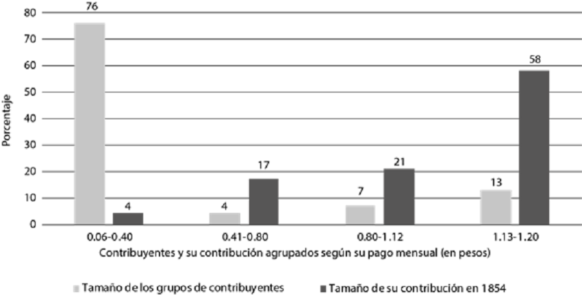 El 82% de la muestra de contribuyentes de San Luis Potosí que pagó el impuesto lo hizo con atraso. Ni siquiera el gobernador, Anastasio Parrodi, lo hizo a tiempo.40 A pesar de ello, no se sancionó a nadie. Dividiendo a los contribuyentes en cuatro grupos según la cantidad que pagaron, es posible descubrir qué grupo pagó más, cuál no solía hacerlo y cuánto aportaban porcentualmente. El resultado fue interesante. Como se puede observar en la gráfica 1, los que evadieron el impuesto pertenecían a los grupos que debían contribuir con menos de 80 centavos al mes, mientras que los que cubrieron arriba de 81 centavos siempre pagaron. Los grupos que siempre pagaron estaban formados por propietarios de las casas más grandes de la ciudad, localizadas en el centro o en lugares estratégicos. Las personas que, por su parte, no solían pagar, vivían en inmuebles pequeños, con sólo una puerta y a veces una ventana. No eran considerados “pobres” para eximirles el impuesto, porque sus casas tenían más de tres piezas. Como se puede observar en la gráfica 2, eran el 80% de la muestra, aunque sólo aportaron 21% de lo recaudado. Los otros dos grupos que siempre pagaron, en cambio, aportaron 79%, pese a que sólo eran el 20% de la muestra.