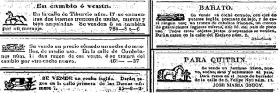 A diferencia de las contribuciones a puertas y ventanas y a perros, los impuestos a coches y caballos no dieron tantos problemas. Los había de dos tipos: a carros particulares y a carros de alquiler. Hoy en día llamaríamos taxis a estos últimos. No fueron creados por Santa Anna, sino que se adoptaron desde la colonia, también por influencia europea como forma de gravar la riqueza. La historiografía liberal del siglo XIX no los agregó a la lista de contribuciones “odiosas y vejatorias”, sino la del XX, y no pudo haberlo hecho, ya que tenían años de ser cobrados y los regímenes liberales lo siguieron haciendo. La única queja en su tiempo fue de Olavarría (1988), pero porque Santa Anna eximió del pago a su propio carro, al del arzobispo y al de ciertos funcionarios (pp. 815-816).