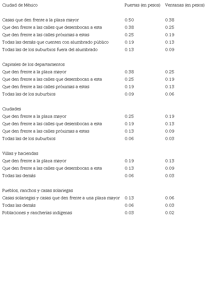 En ese tenor, el 9 de enero de 1854, Santa Anna decretó la contribución a puertas y ventanas.10 La supresión del Congreso y la centralización de poderes en el ejecutivo posibilitó que pudiera estipular cualquier impuesto sin debate ni oposición. Fue Ignacio Sierra y Rosso, ministro de Hacienda y consejero de Estado, quien sugirió su adopción. Era xalapeño, al igual que Santa Anna, y había participado con él en 1847 como ministro de Relaciones Exteriores. El impuesto fue denominado “contribución de luces exteriores”, pues lo que decía cobrar era el derecho a la luz solar y de farol que ingresaba a las casas. Fue publicado en periódicos, pegado en las calles y difundido en los departamentos.11 Según el decreto del 9 de enero, su propósito era gravar la cantidad de puertas de cada casa, incluyendo zaguanes o cocheras, y ventanas o balcones. La tarifa era progresiva y variaba según el sitio de la casa (véase cuadro 1). Una vivienda de la ciudad de México, por ejemplo, pagaba más que cualquier otra del país, y si daba frente a la plaza mayor, pagaba más que las de los suburbios. Según se estipuló, se planeaba que la recaudación fuera mensual y se hiciera sin aumento de empleados ni gastos. Fueron eximidas del pago las casas solariegas “de gentes pobres”, las que se hallaran deshabitadas, las del Estado, iglesias, conventos, hospitales, hospicios, escuelas gratuitas y palacios de gobierno, episcopales y municipales. Aunque Sierra y Rosso decretó el impuesto, no pasó un mes antes de que abandonara el ministerio, por lo que su gestión correspondió a sus sucesores, Luis Parres y Manuel Olasagarre. El objetivo del impuesto fue financiar los gastos del Ministerio de Guerra y engrosar las guarniciones departamentales.12 El gobierno de Santa Anna buscó respaldarse en las fuerzas armadas. De 1854 a 1855, 94% de los egresos fueron dirigidos a ese rubro (Tenenbaum, 1985, p. 214).
