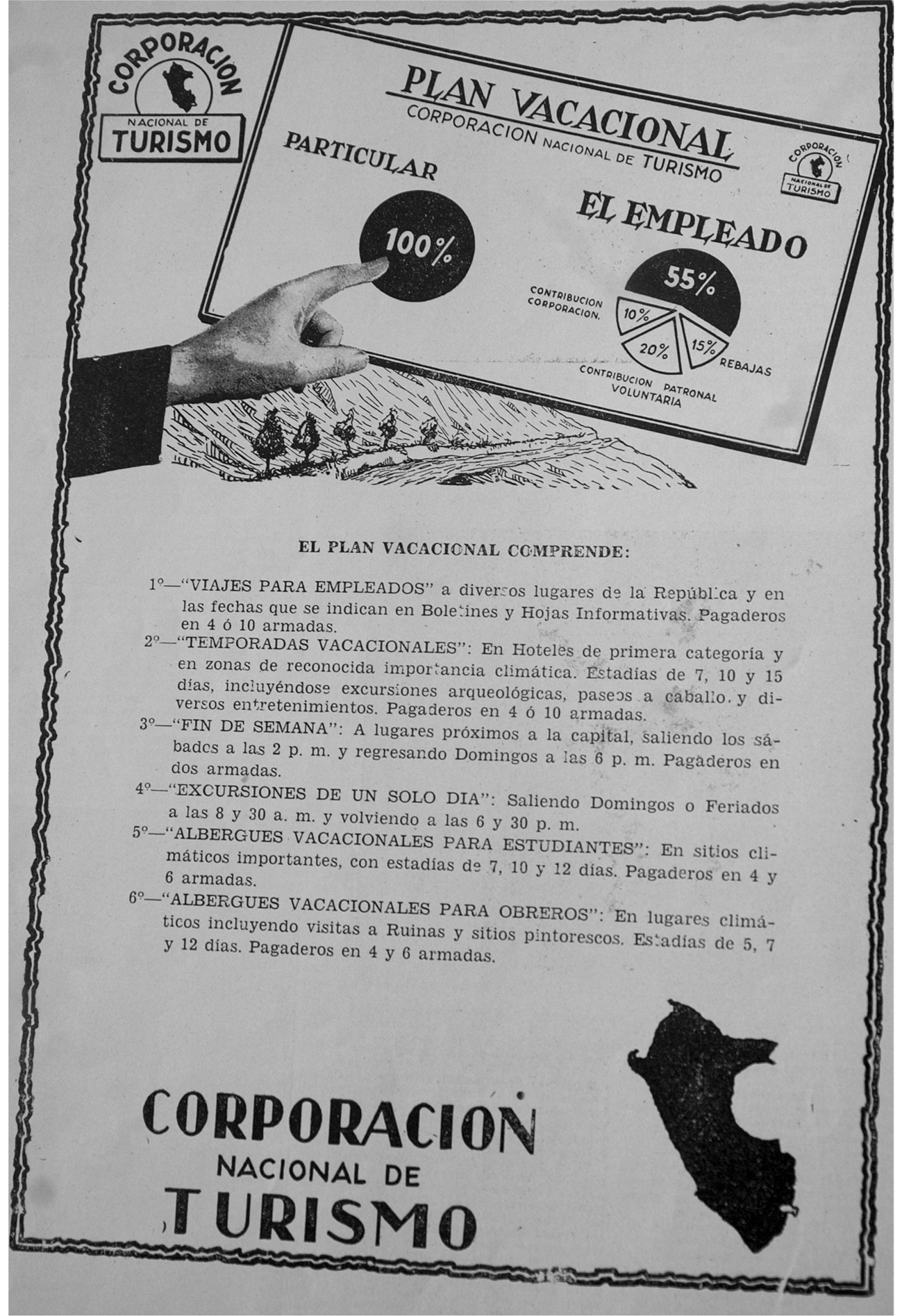 Así pues, bajo la idea del turismo social se creó la dependencia de informaciones y viajes de la CNT. Se concibe el Plan de Viajes Vacacionales, un programa que tenía a su vez varios planes: para empleados, estudiantes, obreros y profesionales. Las agencias de viajes privadas organizaban los paquetes y los promocionaba con la CNT. El usuario, a través de la CNT, le pagaba a la agencia por el precio del paquete, en el cual se incluía un descuento del precio original, que era cubierto por la Corporación. Allí había una subvención estatal. Pero había otra adicional, pues la CNT le proporcionaría al usuario un monto de crédito el cual luego pagaría en cuotas mensuales -que eran de cuatro o diez mensualidades para empleados, y de cuatro o seis para estudiantes y obreros- para cubrir parte del costo del paquete. Dado que la idea era fomentar las vacaciones pagadas, había además un aporte privado: la empresa del trabajador cubría un pequeño monto como parte de su pago por vacaciones. Finalmente, el usuario pagaba el costo restante con recursos propios. Teóricamente se cubría el costo del plan de esta manera: un descuento de 15% al ofrecerse el paquete, 10% por el crédito de la CNT, el 20% por el pago de la empresa al trabajador y el 55% restante sufragado por este mismo trabajador (Bentín Mujica, 1947). El Plan empezó a operar a fines de 1946.