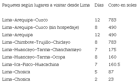 La corporación buscó organizar mejor los paquetes. El paquete para el sur, entre un turismo de playas y campiñas (Pisco, Ica, Huacachina, Chala, Camaná, Mollendo, Ilo, Moquegua y Tacna), ligado mayormente al uso de los hoteles de turistas existentes; y el turismo de sierras y “montañas” -selvas altas- (Abancay, Arequipa, Juliaca, Cuzco, Machu Picchu y Puno).19 Es bueno recordar que los viajes no sólo eran de Lima hacia el resto del país, sino también se promocionaba el Plan entre empleados de las ciudades de Perú hacia Lima. En junio de 1947 se publicitaba que un grupo de empleados de la ciudad de Arequipa había visitado Lima gracias al Plan. Eran diez empleados los que se habían acogido a un paquete de Travel Service S. A.20 (véase cuadro 1).