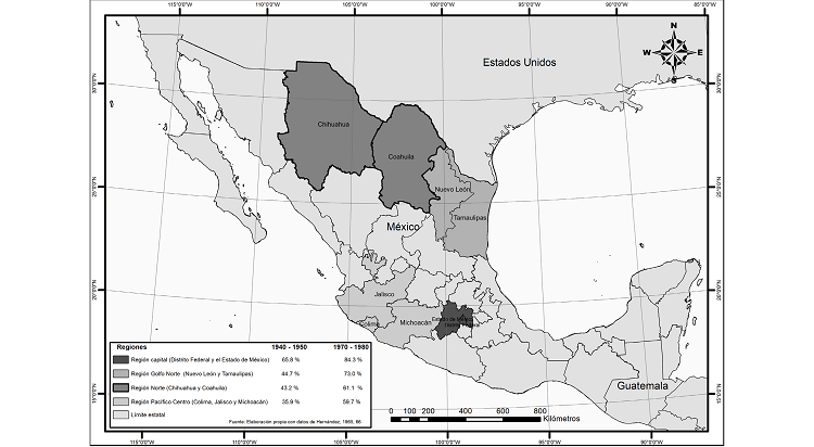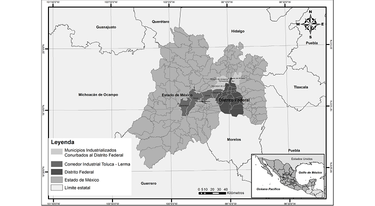 De acuerdo con el estudio de Hernández (1983), entre las regiones que mayor despegue industrial alcanzaron, está la que denominó región Capital, integrada por el DF y Estado de México (véase mapa 1).