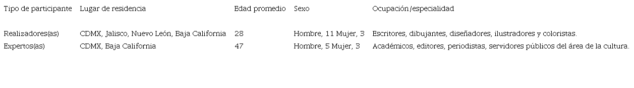 Con base en guías diferenciadas, se entevistó a informates clave, tanto a realizadores(as) de cómics, considerados como la parte creativa y artística, como a profesionales expertos(as) en la industria. El cuadro 1 presenta las principales características de la muestra. De los realizadores, se obtuvo información sobre las capacidades y facilidades con las que se desarrollan las distintas actividades dentro de la cadena de valor (por ejemplo, de aprendizaje, de autogestión y de relaciones con editoriales); de los expertos, se obtuvo información sobre perspectivas globales de la industria del cómic (por ejemplo, mecanismos de distribución, comercialización, oportunidades de inversión, acceso al mercado, visión de la política pública y capacidades y necesidades del sector).