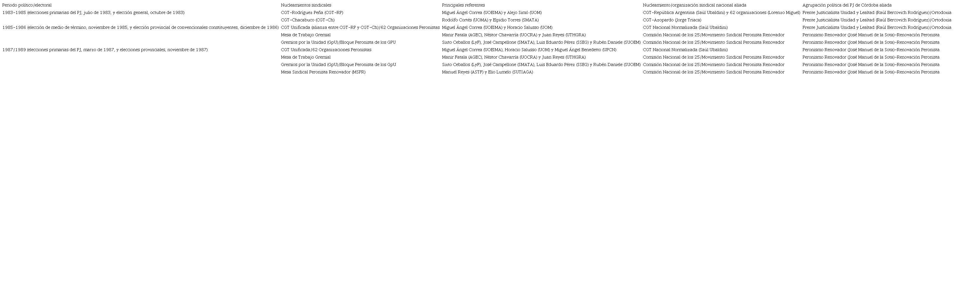 El ascenso de la RP en los comicios internos del 29 de marzo de 1987 modificó parcialmente la relación entre el PJ de Córdoba y los nucleamientos sindicales y dotó al partido de una nueva dinámica político-electoral. En la contienda se implementó el voto directo de los afiliados para elegir autoridades partidarias y determinados cargos electivos (gobernador y vicegobernador e intendente de la ciudad capital), una metodología originariamente planteada por la RP. Allí se impuso por amplio margen la Lista 10 conducida por la RP, cuya fórmula para la gobernación y la intendencia fue integrada por De la Sota, Enrique Gastaldi y Miguel Balestrini.28 Con anterioridad a la elección primaria la RP había ampliado su base gremial, consiguiendo el apoyo del sindicalismo ortodoxo que anteriormente se había desenvuelto bajo la órbita de Bercovich Rodríguez. En tal sentido, De la Sota selló un acuerdo con Salusso, incluyendo cargos partidarios y políticos para “las 62”. Asimismo, la RP ya contaba con una base sindical de apoyo: la Mesa de Trabajo, el Bloque Peronista de los GpU y la Mesa Sindical Peronista Renovador (MSPR), referenciada en Manuel Reyes (ASTF) y Elio Lumelo (SUTIAGA).29 Si bien los sindicatos alineados con la RP eran numéricamente reducidos en relación con aquellos alineados con Bercovich Rodríguez, estos contaban con un peso significativo dentro del movimiento obrero cordobés. Estas vertientes del sindicalismo encontraron en la RP a un aliado para la democratización del partido y la conformación de un nuevo proyecto político de identidad justicialista, capaz de expresar las demandas de los sectores populares.30
