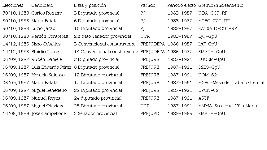 Luego del CP el PJ anunció la conformación de un frente electoral con la DC -el Frente Justicialista Renovador (FREJURE)- y la nominación de Domingo Felipe Cavallo, economista de la Fundación Mediterránea (FM), como candidato extrapartidario a diputado nacional en el tercer lugar que había pretendido ocupar el sindicalismo.39 Con ello, el PJ buscó acercarse a los sectores empresarios de la provincia y cautivar un grupo de votantes donde la prédica de Cavallo ganaba adhesiones. Sobre esa base, las interpelaciones a la clase trabajadora o las alusiones a los símbolos justicialistas cedieron lugar a propuestas de políticas públicas orientadas a seducir a distintos sectores del electorado, como las mujeres y la juventud.40 En este marco, el protagonismo de los dirigentes sindicales fue más reducido que en 1983, ya que su representación no sólo no era relevante para la estrategia electoral del FREJURE, sino, incluso, desfavorable. Al respecto, Eduardo González Olguín, dirigente de la agrupación Intransigencia y Movilización Peronista (IMP) aliada a la RP, señala: