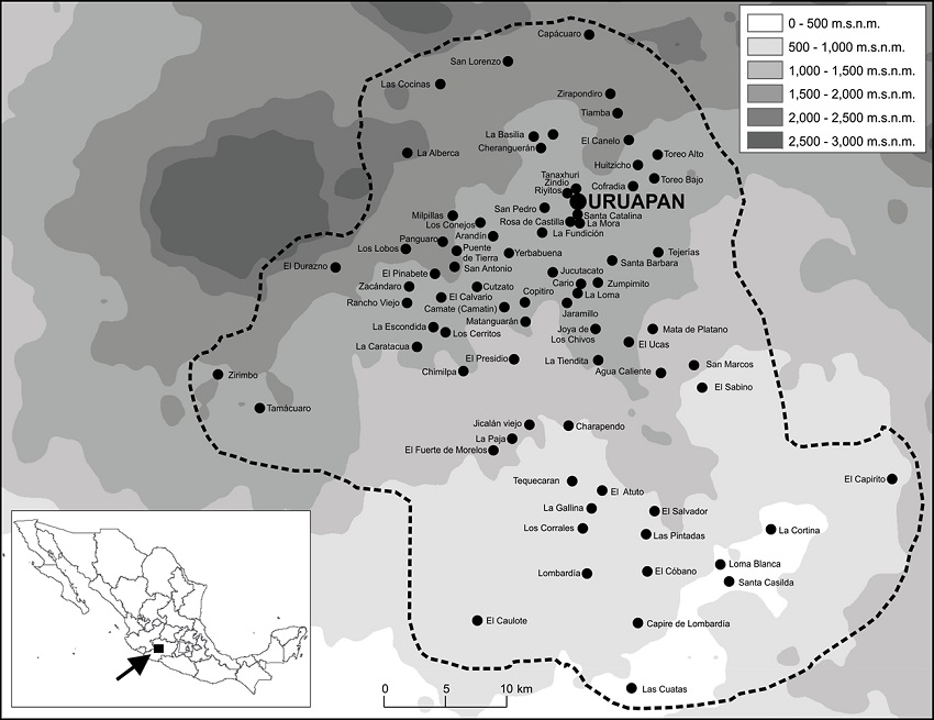 Uruapan se ubica en el centro del estado de Michoacán, a 1 620 msnm con un clima semicálido subhúmedo con abundantes lluvias en verano, el municipio abarca una zona que transcurre entre los 2 340 y los 800 msnm, el clima varía entre el templado subhúmedo con lluvias y el cálido húmedo (INEGI, 2005). Es un asentamiento de origen prehispánico, durante el virreinato fue un pueblo de indios, aunque tuvo un proceso de mestizaje que trajo como consecuencia el dominio poblacional de la Gente de Razón, los no indígenas, en la segunda mitad del siglo XVIII. En el México independiente se recuperó de los estragos de la guerra y comenzó a adquirir mayor importancia (Talavera, 2011, pp. 22-25, 78 y 266).