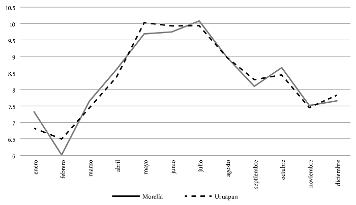 Las sociedades del antiguo régimen demográfico tenían una alta mortalidad normal, tal como sucedió en Uruapan y Morelia. A lo largo de un año se tenía una elevación a partir de marzo, llegando a la cima entre mayo y julio, posterior descenso hasta septiembre y octubre, cuando llega a una meseta para continuar bajando (véase gráfica 1). El repunte ocurría con temperaturas elevadas al inicio de la época de lluvias, lo que facilitaba la aparición de enfermedades gastrointestinales (Pardo y Talavera, 2021, p. 247).