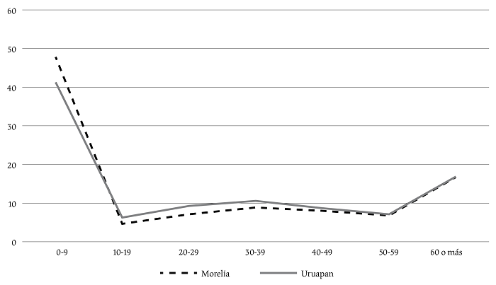 La mortalidad normal por rangos de edad fue similar en ambas localidades, una forma en U que ya se había señalado anteriormente (véase gráfica 2), siendo mayor en los niños de hasta nueve años y aumentando en los mayores de 60 años (Pardo y Talavera, 2021, p. 247). En los más pequeños el porcentaje fue cercano a 50%, en Morelia fue de 47.8% y algo más bajo en Uruapan con 43.9%, quizás debido a un ligero subregistro.