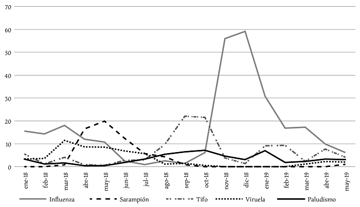 Las enfermedades que generaron un aumento mayor de muertes en 1918 provinieron de los efectos de la influenza. Como parte de los cálculos de la mortalidad por esta pandemia se incluyeron las causas por enfermedades respiratorias como la gripa, pulmonía, neumonía, bronconeumonía, broncopulmonía o fiebre gripal. La principal causa en 1918 fue la influenza con 17.6%, incluyendo las enfermedades respiratorias, seguida por enteritis con 10.7% y disentería con 8.2%. Estas dos últimas eran de las principales causas de muerte en años normales, después siguieron brotes epidémicos como el sarampión (6.6%), tifo (6.2%), viruela (4.1%) y paludismo (3.3%) (véase gráfica 3), en sexto lugar estuvo la diarrea con 5.6%, otra enfermedad de años normales. Si bien agrupando las enfermedades del sistema digestivo, estas quedan en primer lugar; la elevación de las enfermedades respiratorias en un segmento del año evidencia el impacto de la pandemia.