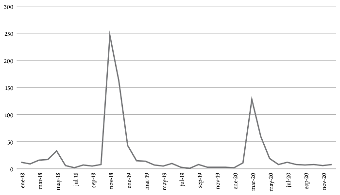 La primera oleada se reflejó en Uruapan con un aumento de las enfermedades respiratorias entre el 1 de marzo y el 29 de mayo, evidencia de una gran velocidad en el contagio (véase gráfica 4). La segunda se presentó con cuadros gripales y complicaciones pulmonares y se desató casi simultáneamente en Europa, América y África (Echeverri, 2018, p. 22; Porras, 2020, p. 37). En Uruapan se manifestó a partir del 28 de octubre, su fase más intensa fue entre el 7 de noviembre y el 22 de diciembre; aunque la mortalidad se prolongó hasta el 3 de marzo del año siguiente, es posible que las muertes a principio del año 1919 correspondieran a la tercera ola. La cuarta ola se hizo presente en Uruapan entre el 27 de febrero y el 25 de abril de 1920.