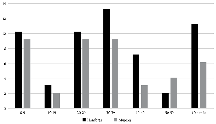 La distribución por sexo fue diferente en la primera oleada de 1918 cuando se invierten las proporciones, víctimas masculinas 58.6% y femeninas 41.4%; de manera similar ocurrió a inicios de 1920, los hombres con 57.1% y las mujeres con 42.9% (véase gráfica 7). En este último caso los hombres aventajaron a las mujeres en todos los rangos salvo entre los de 50 a 59 años.