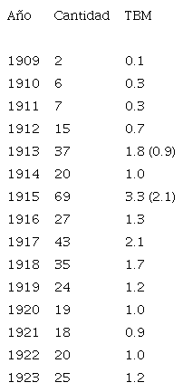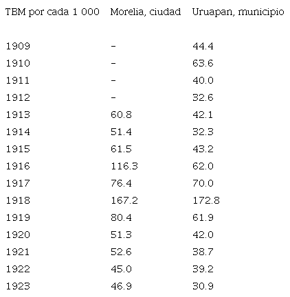 La TBM en Uruapan y Morelia muestra diferencias en varios años, de manera general resultó más elevada en la capital, sobre todo en 1916 cuando se hizo presente una epidemia de tifo; en contraste, en 1918, año de la influenza, fueron próximas las tasas (véase cuadro 1). En el caso de Morelia se cuenta con la captura de datos entre 1913 y 1923. De manera tendencial la capital mostró un empeoramiento en las condiciones de vida, quizás por la migración de personas que buscaban seguridad en las ciudades y que vivieron en condiciones de hacinamiento, marginación y pobreza.