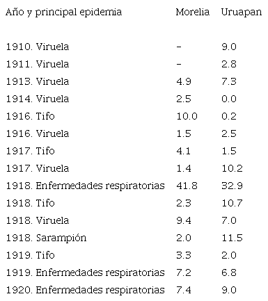La TBM específica por causa de muerte muestra el impacto de las epidemias en los diversos años cuando aparecían entre las diez primeras causas de muerte (véase cuadro 2). Por ejemplo, la viruela afectó más a Uruapan en 1913 y 1917, por el contrario, el tifo tuvo mayor impacto en Morelia en 1917 y 1919, pero sobre todo en 1916; caso contrario fue 1918 cuando el tifo se cernió más en Uruapan. Las enfermedades respiratorias, es decir el impacto de la influenza y las enfermedades secundarias, se manifestaron en los años 1918, 1919 y 1920, impactando más a la capital en 1918. Este mismo año el sarampión atacó severamente a la población infantil de Uruapan; este grupo de edad tuvo como primera causa de muerte la viruela en 1910 y 1911, y el impacto fue mayor en el primer año.