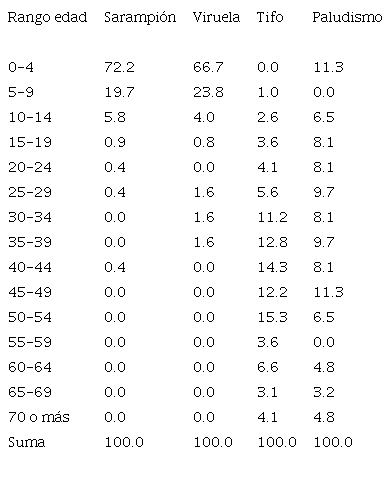 Resulta evidente las diferencias en los grupos de edad en las enfermedades; sarampión y viruela afectaron de manera brutal a los menores de cinco años, en seguida al grupo de 5 a 9 años, en tercer lugar, el rango de 10-14 años. A diferencia del tifo con mayor impacto en los adultos, entre 30 y 54 años, y sin víctimas en los menores de cinco años. Un comportamiento diferente tuvo el paludismo, los rangos mayores fueron de 0-4 años y 45-49 años con 11.3%, los demás rangos presentaron cifras de entre 3.2 y 9.7%; dos no tuvieron víctimas, 5-9 y 55-59 años. Se puede concluir que el paludismo fue propiamente una enfermedad de adultos, con escaso impacto en los niños, tomando en cuenta la mortalidad normal de este grupo de edad.