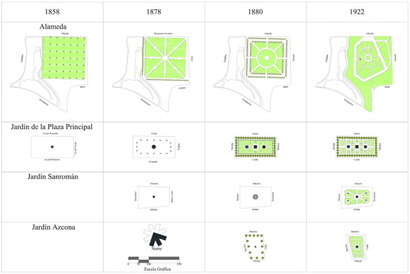 Es así que, las calles y las plazas dejaron de ser el único lugar donde se realizaban diversas actividades; se aumentó la construcción de espacios específicos para los usos que ahí se hacían, haciendo que los jardines atendieran la recreación de la población bajo los ideales de higiene, estética y moralidad (Eguiarte, 1992). A partir de estas justificaciones, se facilitaría el resurgimiento de las alamedas en México, nombre que recibieron cotidianamente estos jardines. Según Ribera (2019) la mayoría se inauguró entre 1830 y 1850, a excepción de la que se hizo en la Ciudad de México en el siglo XVI, y de otras pocas que se delinearon en diversas capitales desde el siglo XVIII. De acuerdo con Castro (2001) , sus dimensiones se definieron según la importancia y tamaño de la población, así como de su potencial económico y nivel cultural dentro de sus regiones.
