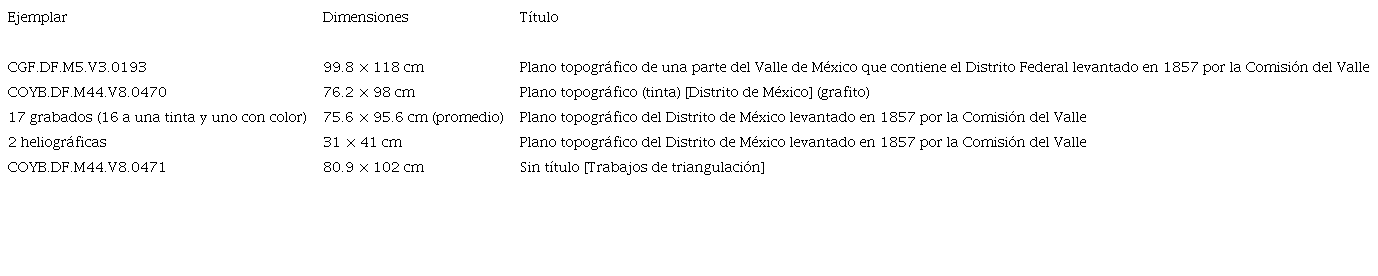 “717 a 718. Plano topográfico del Distrito de México levantado en 1857 por la Comisión del Valle. Grabado en todas sus especialidades, e impreso por los alumnos de la clase del grabado en lámina de la Academia I. de San Carlos D. Tomás de la Peña, D. Ventura Enciso y D. Santiago Álvarez, el año de 1864 bajo la dirección del Sor. D Luis S. Campa, profesor del ramo” (Orozco, 1871, p. 122).