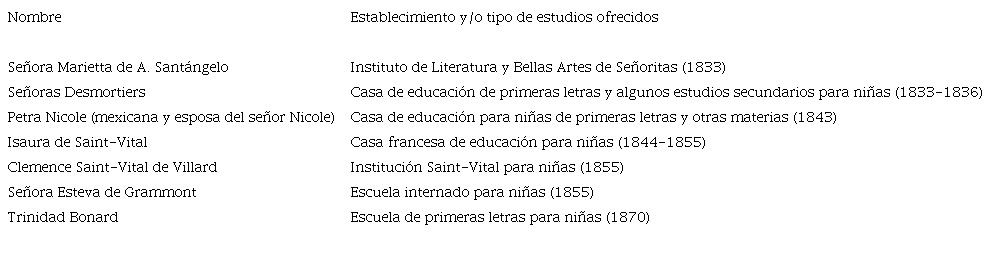 Una directriz es acerca de la presencia cada vez más notoria de establecimientos educativos particulares de extranjeros. El cuadro 1 de maestros muestra esa tendencia a partir de 1822, con la creación de la primera escuela lancasteriana El Sol, y aumentó a partir de 1828, sobre todo durante el primer gobierno de Anastasio Bustamante (1830-1833), con la llegada de las primeras maestras. El artículo no revisa la procedencia de las y los educadores franceses, pero se puede decir que, al menos la mitad de ellos, porque así lo señalaron, provenía de varios lugares de Francia. Unos más venían de otros lugares del mundo atlántico de la época. Por ejemplo, Marietta Santangelo (de posible ascendencia italiana) provenía de Filadelfia, las señoras Desmontiers y las hermanas Isaura y Clemence de San Vital ya habían dirigido escuelas en Filadelfia y Nueva York y decidieron probar suerte en México, precisamente en la época de Bustamante; Claudio Gen habría comenzado a enseñar aproximadamente desde 1816 en varios países del hemisferio y había estado en Jalisco. Otras posiblemente llegaron directamente de Francia, como Trinidad Bonard, residente en la ciudad de México, y algunas maestras asentadas en varios estados del país.4