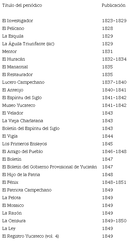 De los 29 periódicos impresos en Campeche entre 1823 y 1849 (véase cuadro 1), tan sólo tres fueron exclusivamente literarios, comenzando con el Museo Yucateco (1841-1842) y El Registro Yucateco (1849),19 editados por Justo Sierra, y Los Primeros Ensayos (1845), fundado por Miguel Duque de Estrada y Luis Aznar Barbachano (Pérez, 1983, p. 209). A pesar de esta escasez de publicaciones especializadas en literatura, debe tomarse en cuenta que el más antiguo periódico literario en la península fue el Museo Yucateco y que El Fénix (1848-1851), pese a ser “noticioso, político, literario y mercantil”, imprimió en su folletín La hija del judío, importante novela histórica del multicitado Sierra.