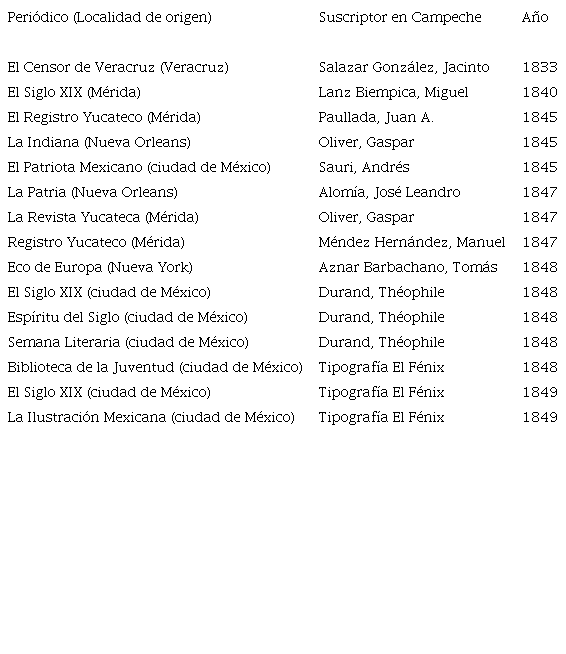 Desde antes de la introducción de la imprenta y del comienzo del periodismo en Campeche, los lectores que contaban con los suficientes recursos tuvieron la posibilidad de suscribirse a publicaciones foráneas. En 1808 y 1809, Juan Francisco Romay26 se anunció como encargado de las suscripciones del Semanario Económico de Noticias Curiosas y Eruditas de la ciudad de México.27 Posteriormente, de 1833 a 1849, se anunció la suscripción de quince periódicos: doce nacionales y tres de Estados Unidos de América. Los periódicos mexicanos provenían de la ciudad de México, Mérida y Veracruz, mientras que los estadunidenses se imprimieron en Nueva Orleans y Nueva York (véase cuadro 2).