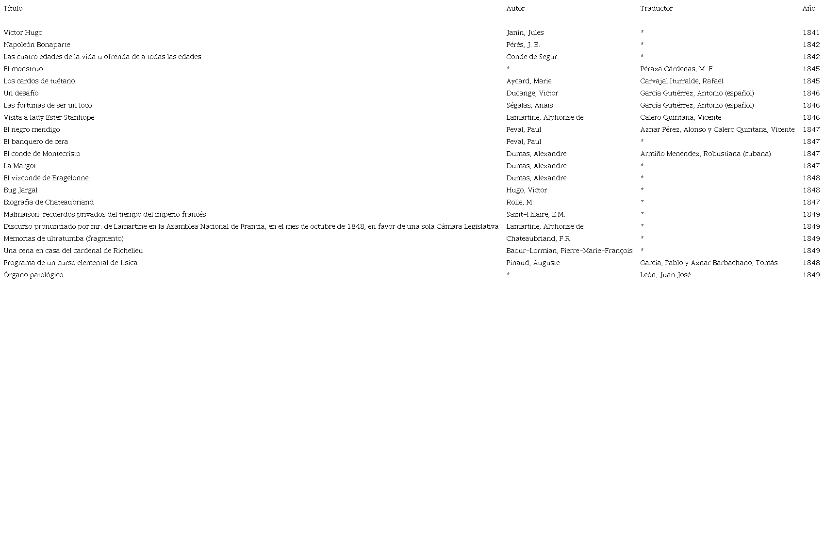 Este conocimiento avanzado de personajes, episodios, autores y libros franceses marchó a la par de la publicación de traducciones en la prensa literaria de Campeche y Mérida (véase cuadro 3). Al respecto, si bien la mayoría de los textos que se han identificado son reediciones provenientes de la prensa española y de la ciudad de México, consta que a partir de 1845 hicieron su aparición traductores campechanos y yucatecos: Tomás Aznar Barbachano, Alonso Aznar Pérez, Vicente Calero Quintana, Rafael Carvajal Iturralde, Pablo García Montilla, Juan José León y Martín Francisco Peraza Cárdenas.