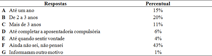 Foi questionado também quanto tempo o servidor pretendia continuar no Abono de Permanência, ou seja, continuar trabalhando na universidade mesmo podendo se aposentar e grande parte respondeu que ainda não definiu por quanto tempo pretende ficar trabalhando na universidade ou só sairá quando chegar a aposentadoria compulsória. Isto pode sugerir o envolvimento desses servidores em continuar efetivamente trabalhando por até 15 anos, uma vez que 66,67% dos servidores que estão no abono e participaram da pesquisa têm de 51 a 60 anos. Babcock (2005) e Dejours (2004) também argumentam a importância subjetiva do trabalho para a vida das pessoas e isto pode ser identificado nas respostas dos pesquisados.